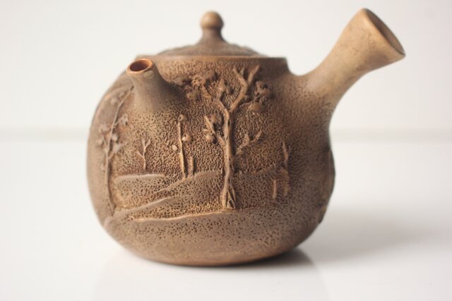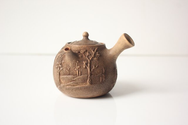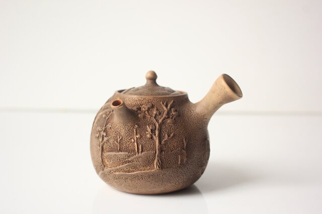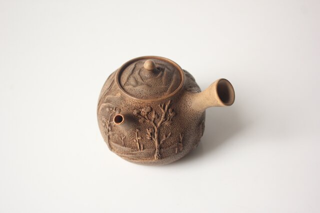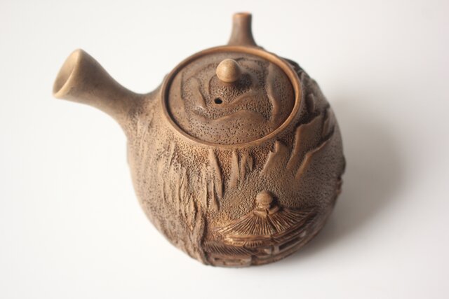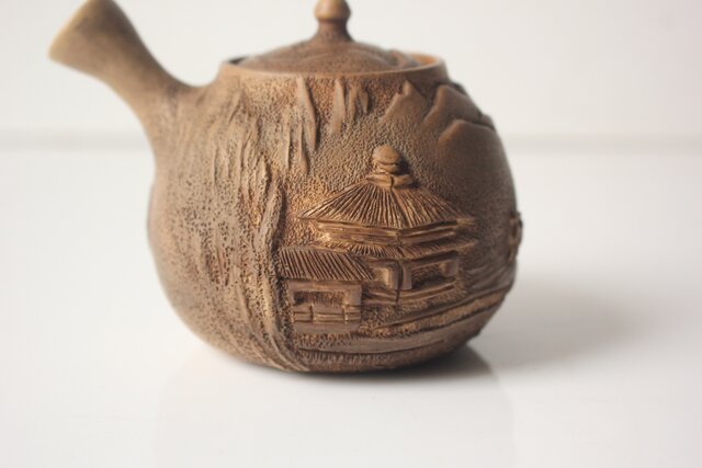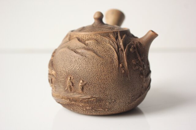 聴松園 米和亭造 竹根意 楼閣山水図 白泥急須 P647
