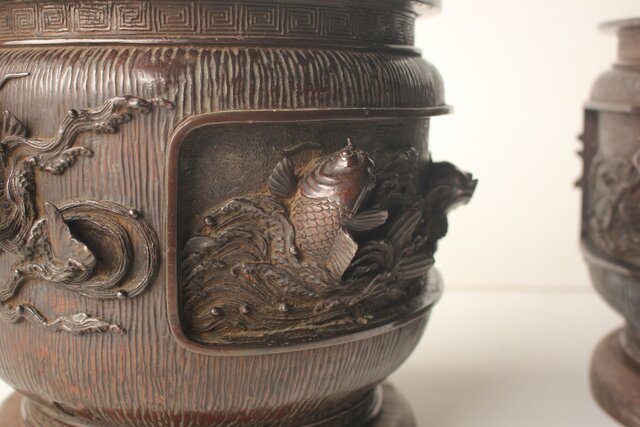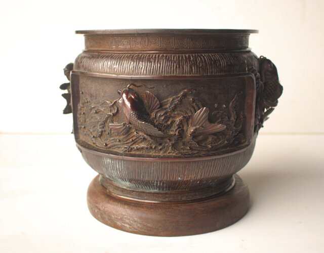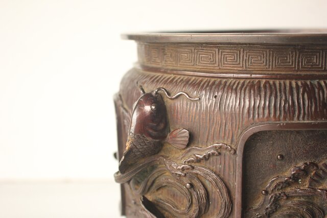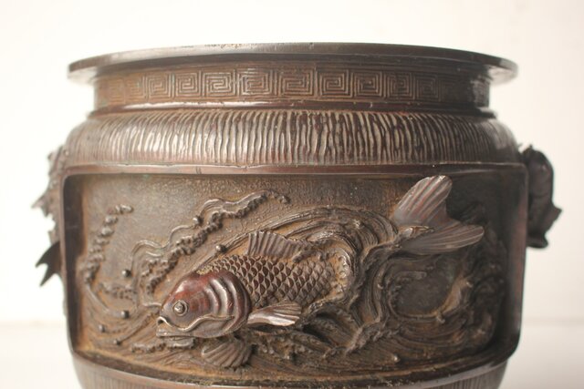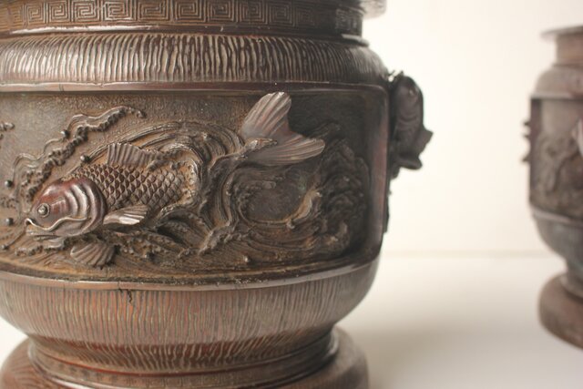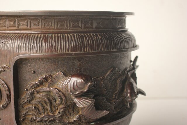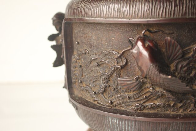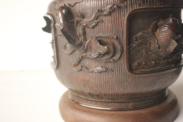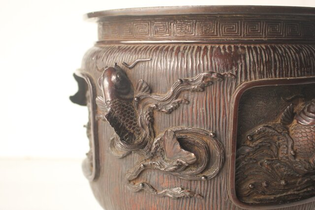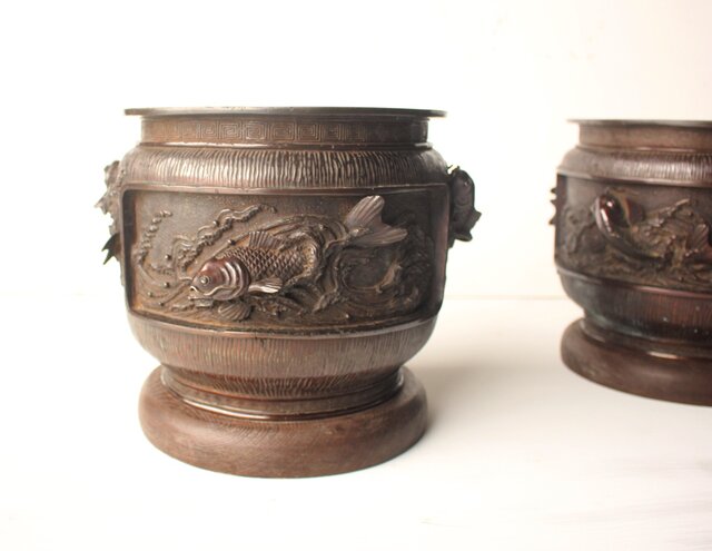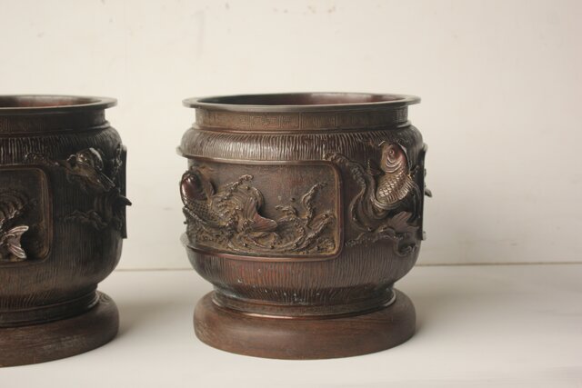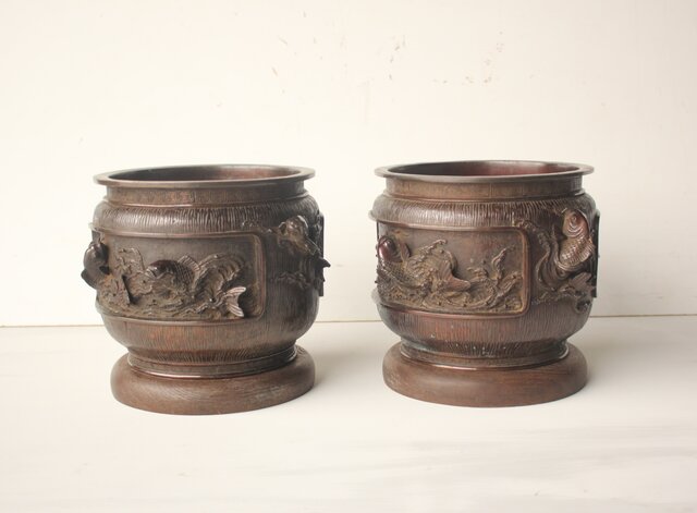 翠松亭梅や造 鋳造 鯉 銅火鉢一対 M493