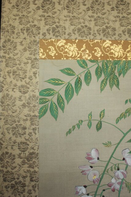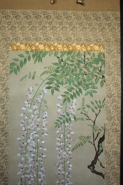 藤の房に顕著な縦長の画面を生かした構図 幹にほどこされた緑青のたらしこみ 花や葉の繊細な色感